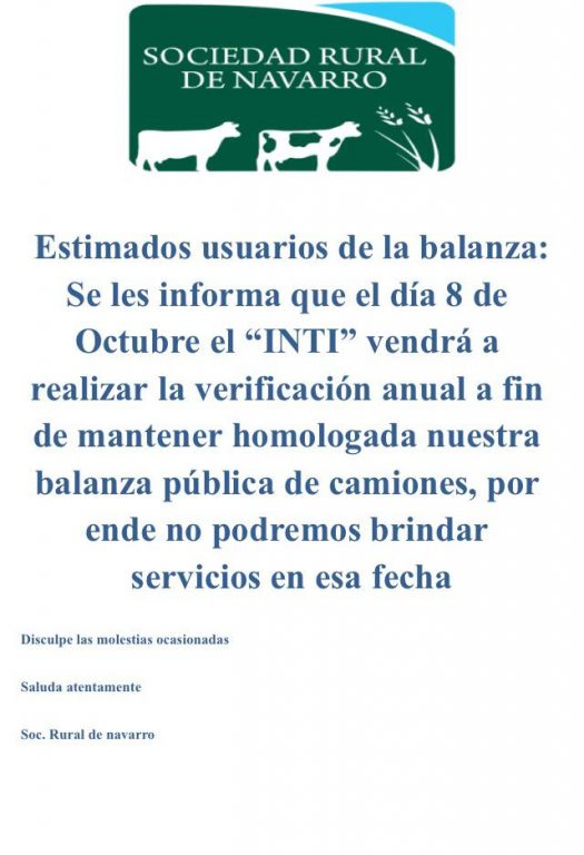 Estimados usuarios de la balanza. Se les informa que el día 8 de octubre, el I.N.T.I. vendrá a realizar la verificación anual a fin de mantener homologada nuestra balanza pública de camiones, por ende no podremos brindar servicios en esa fecha. Disculpe las molestias ocasionadas.