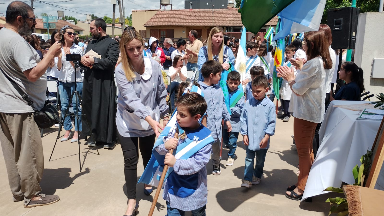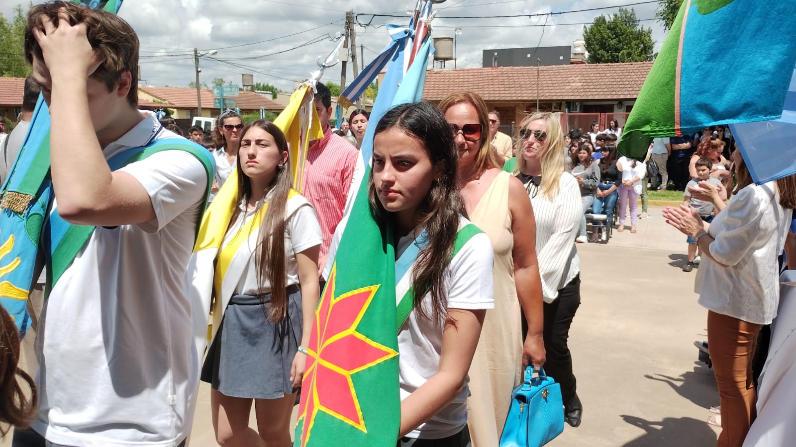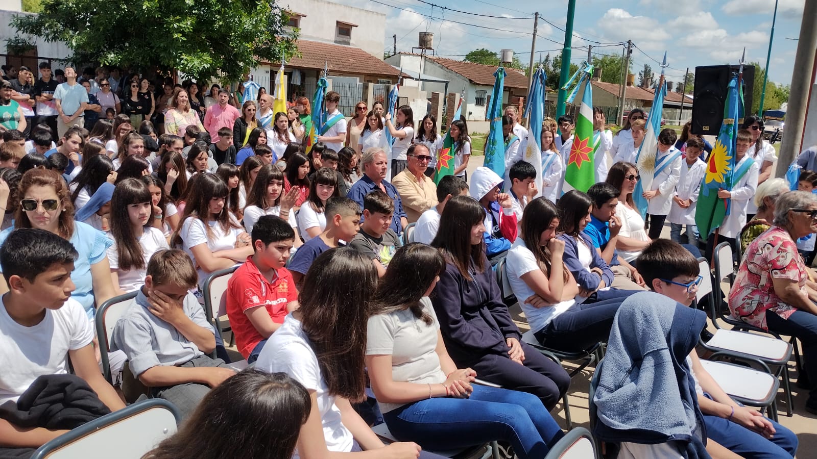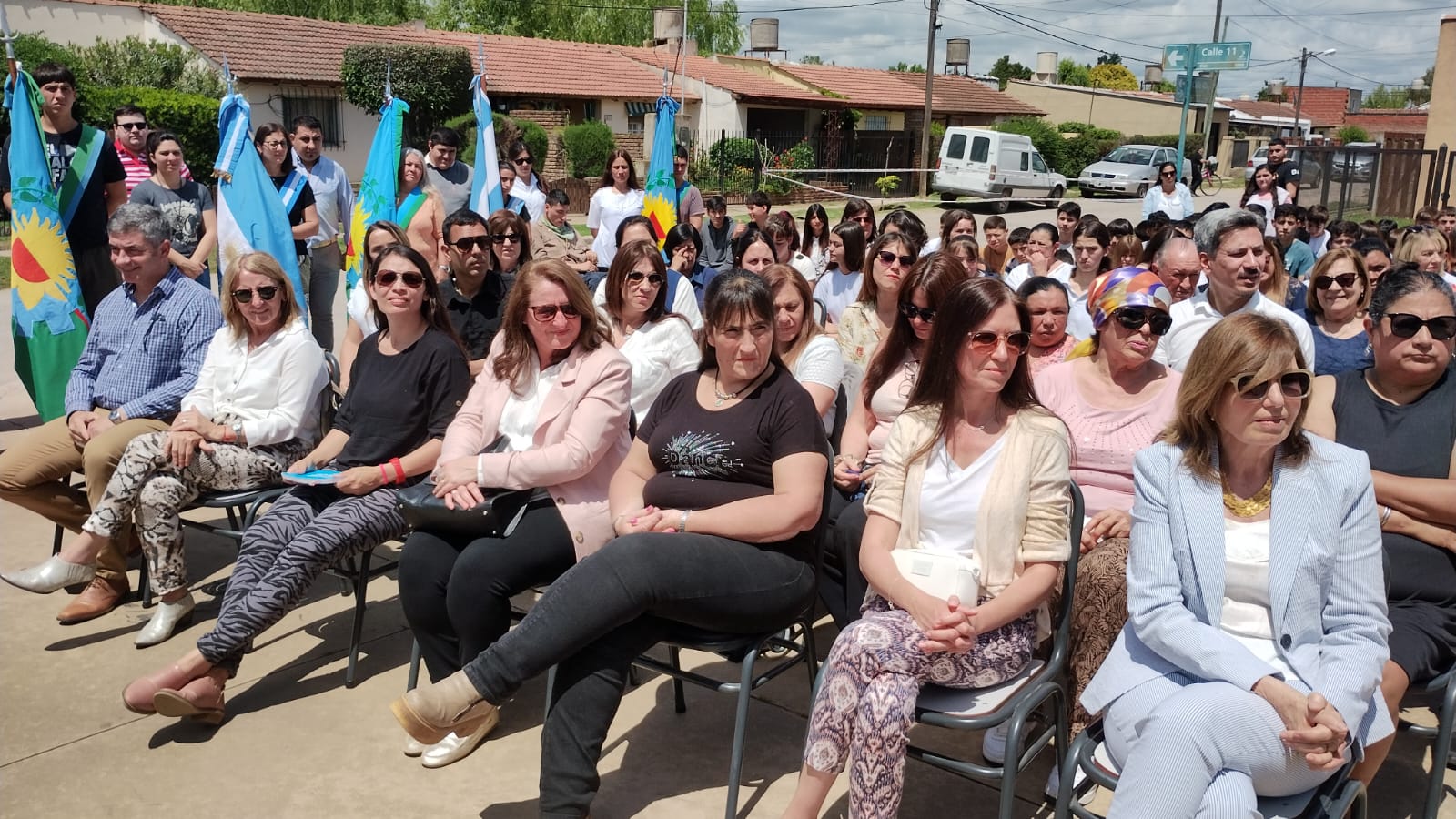 Luego hicieron su entrada las banderas de ceremonia. Bandera Nacional: abanderada Valentina Prieto Etcheber, 1º escolta Luisina Corbetto, 2º escolta Abril Casco, 1º escolta suplente Alejo Nahuel López, 2º escolta suplente Leandro Andrés Vera. Bandera Bonaerense: abanderado Lautaro Alejo Barbosa, 1º escolta Nicoletta Chaar, 2º escolta Agustina del Río, 1º escolta suplente Valentín Tueso. A continuación, se entonaron las estrofas del Himno Nacional Argentino y seguidamente se procedió al decubrimiento de la placa con el nombre de quien de ahora en más identificará a esta institución educativa, “Abdón Resquín Colman”, la que fue bendecida por el Padre Pablo Badano.