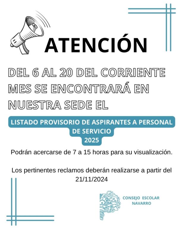 El Consejo Escolar de Navarro informa que del 6 al 20 del corriente mes se encontrará en su sede el listado provisorio de aspirantes a personal de servicio 2025.
