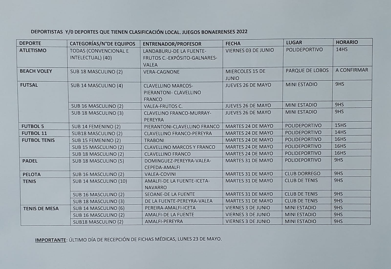 La Secretaría de Deportes de Navarro informa los deportes y/o deportistas que tienen competencia a nivel local y aquellos que ya están clasificados directamente a la etapa regional (a partir del mes de julio) de los Juegos Bonaerenses 2022, tanto en deportes convencionales como para personas con discapacidad. En caso de lluvia, ante cada competencia, se informará los nuevos días de participación. Se recuerda a todos los participantes que deben entregar en nuestra Secretaría (Polideportivo Municipal, de lunes a viernes de 7:30 a 13:30), la ficha de salud y la copia del DNI.