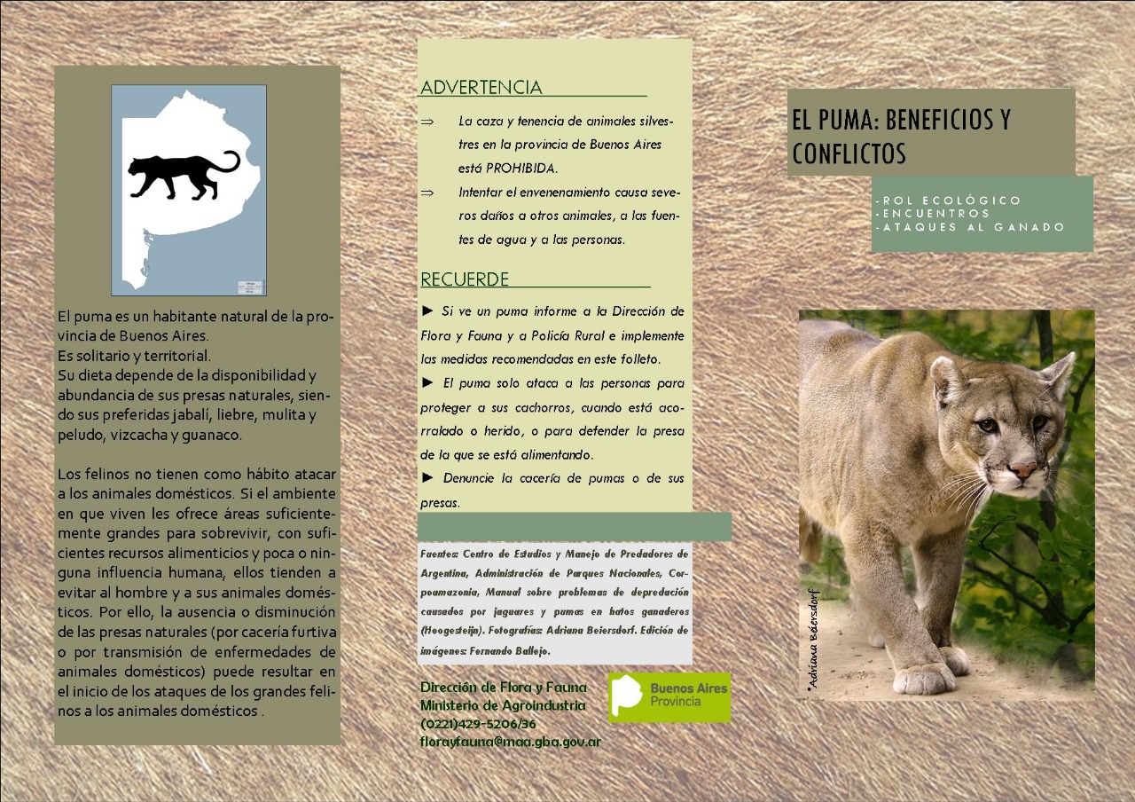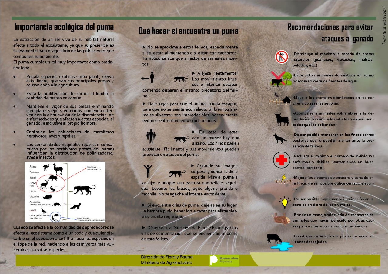 CPR NAVARRO Informa desde el Ministerio de Agroindustria de la Provincia de Buenos Aires, a raíz de la creciente cantidad de avistajes de pumas en la provincia de Buenos Aires y la preocupación manifestada por productores debido a presuntos ataques al ganado, la Dirección de Flora y Fauna del Ministerio de Agroindustria ha elaborado folleto con información sobre la especie y recomendaciones a tomar ante estas situaciones.