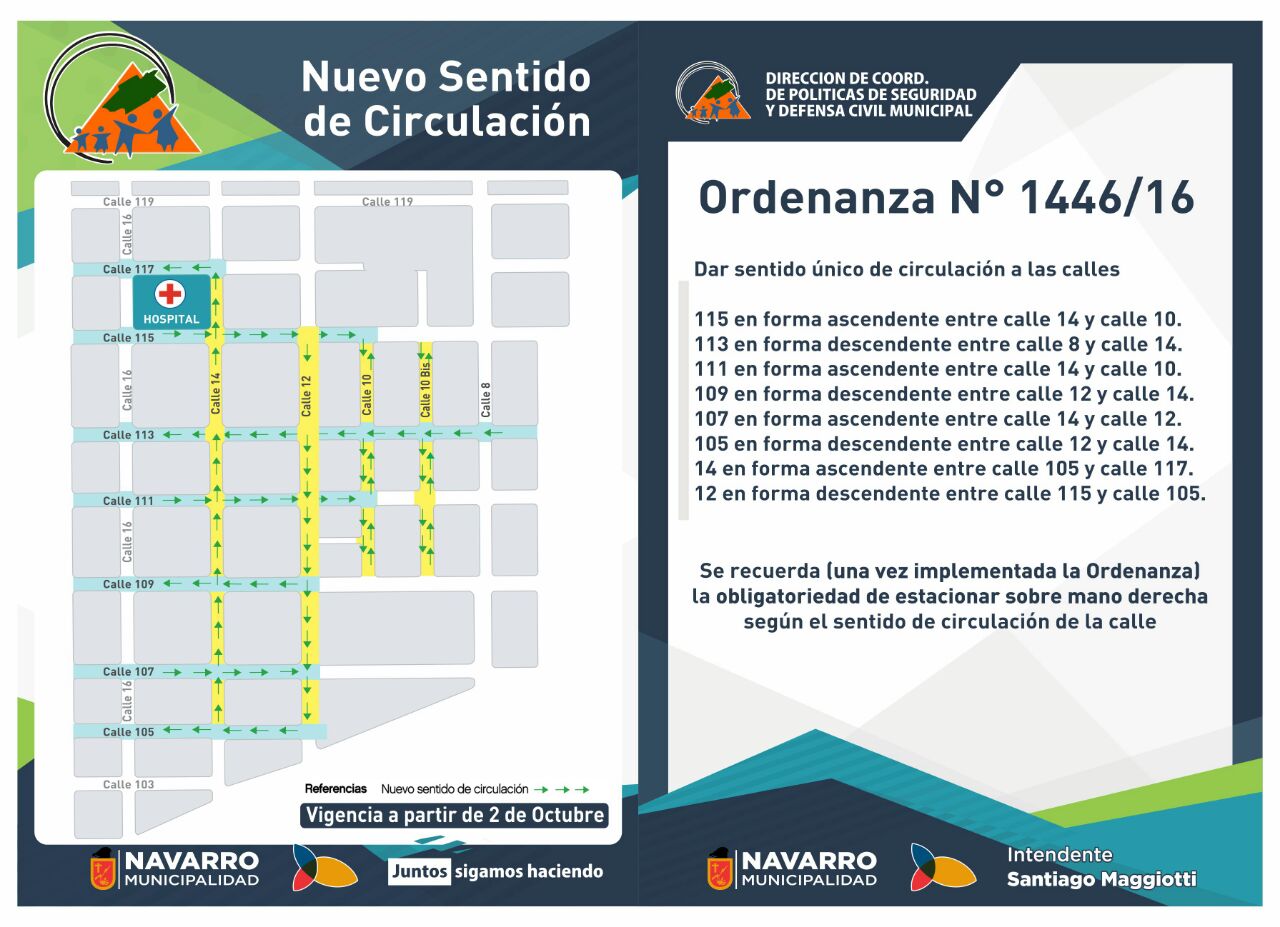 La Municipalidad de Navarro informa que a partir del día 2 de octubre, varias calles cambian de sentido de circulación.