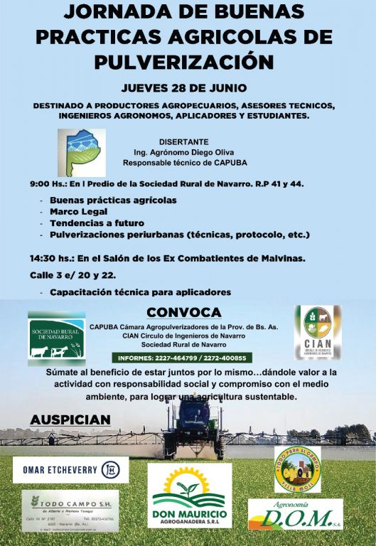 El jueves 28 de junio a las 9 de la mañana dará comienzo una Jornada de Buenas Prácticas Agrícolas de Pulverización en el predio de la Sociedad Rural de Navarro sito en R.P. 41 Y 44. La misma está destinada a productores agropecuarios, asesores técnicos, ingenieros agrónomos, aplicadores y estudiantes. El disertante será, el ingeniero agrónomo Diego Oliva, responsable técnico de C.A.P.U.B.A. (Cámara de Agropulverizadores de la Provincia de Buenos Aires). Se abordarán temas como: buenas prácticas agrícolas, marco legal, tendencias a futuro y pulverizaciones periurbanas (técnicas, protocolo, etc).