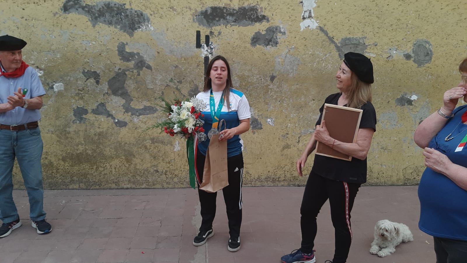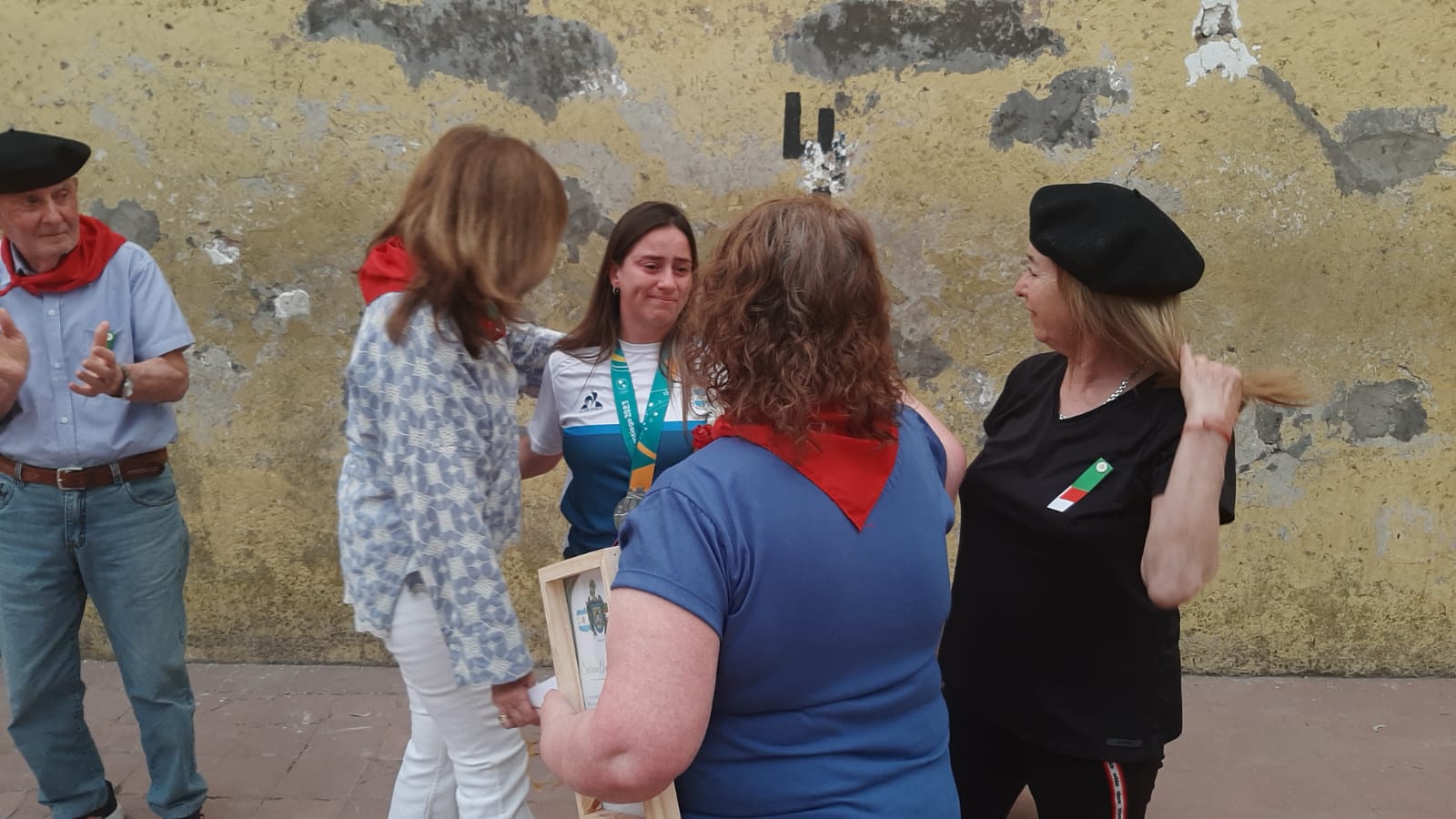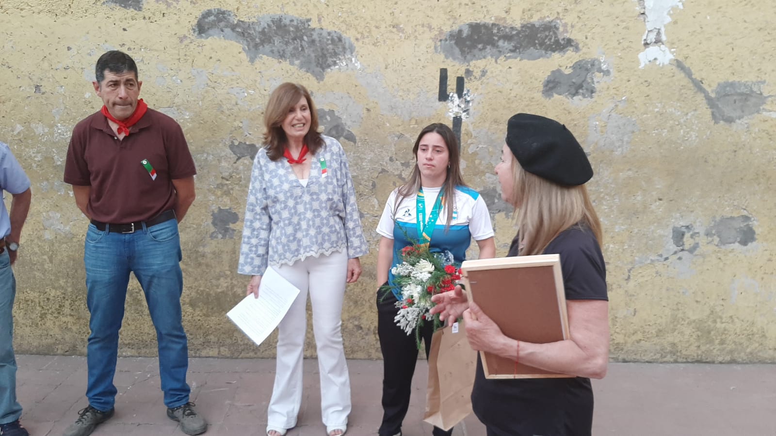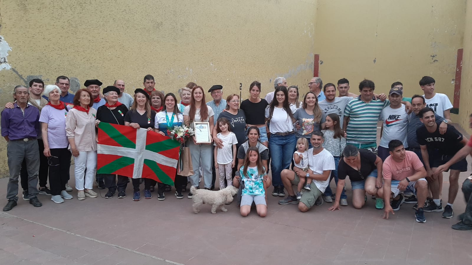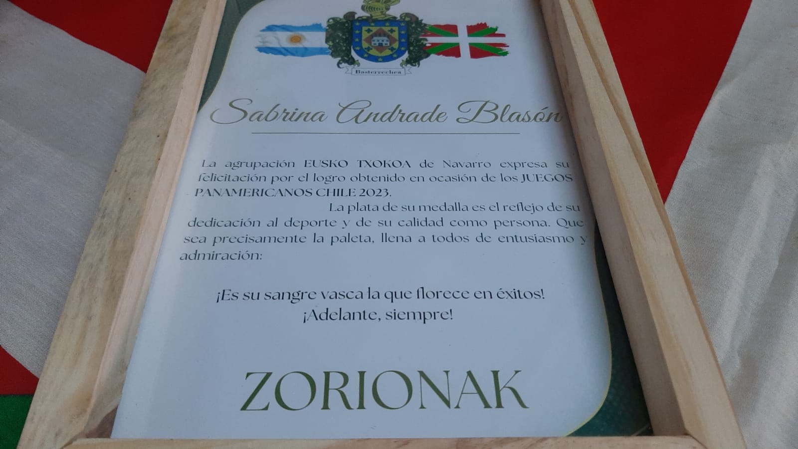 La agrupación vasca EUSKO TXOKOA realizó este lunes a las 19, un pequeño homenaje a nuestra pelotari, Sabrina Andrade Blasón luego de su participación en los Juegos Panamericanos Chile 2023, donde obtuviera la medalla de plata en paleta goma individual. La celebración tuvo lugar en la cancha de paleta de Basterrechea. Fue un sencillo pero muy emotivo acto que compartimos con ustedes en la cámara de Revista Digital El Navarrero.