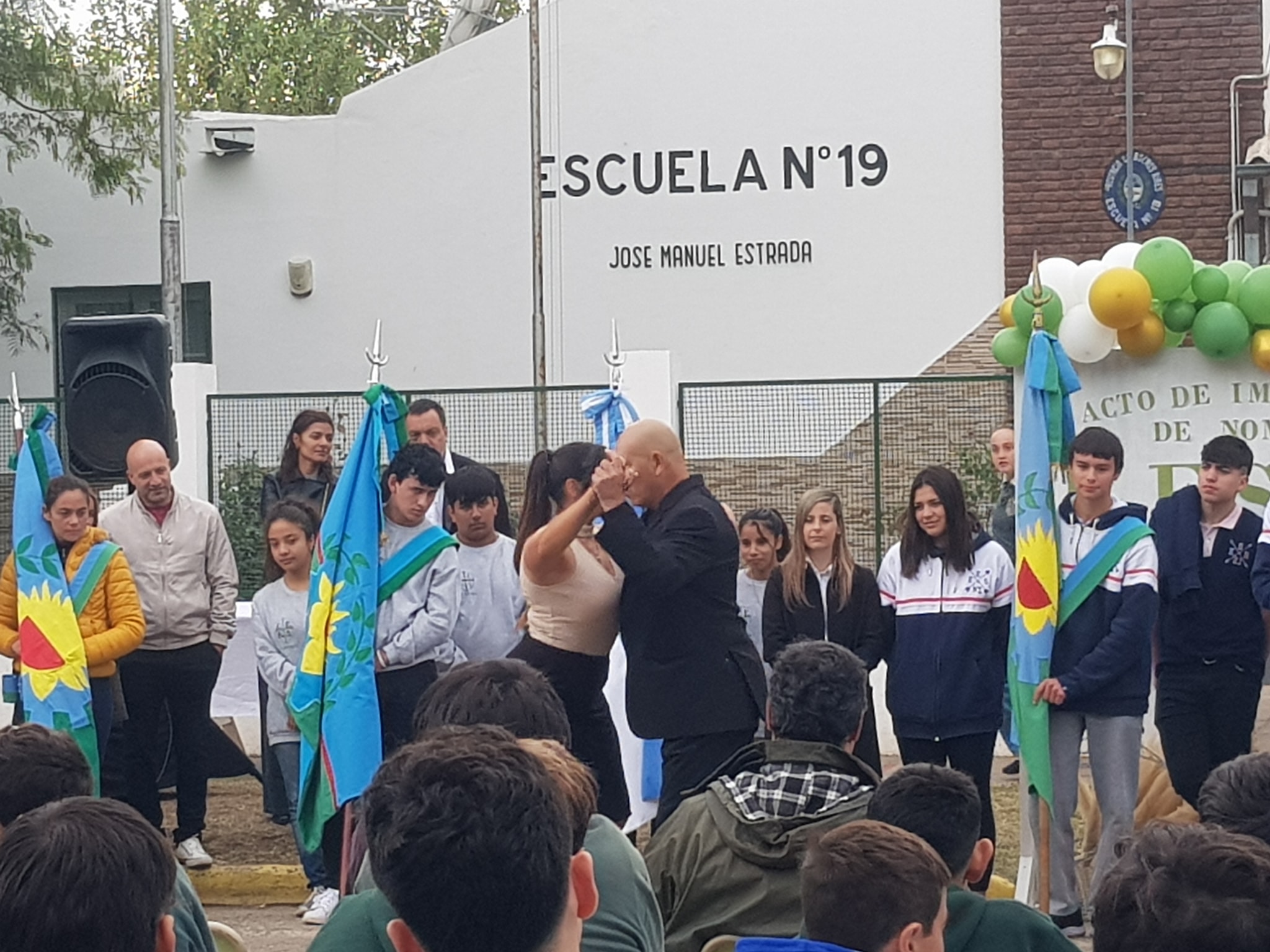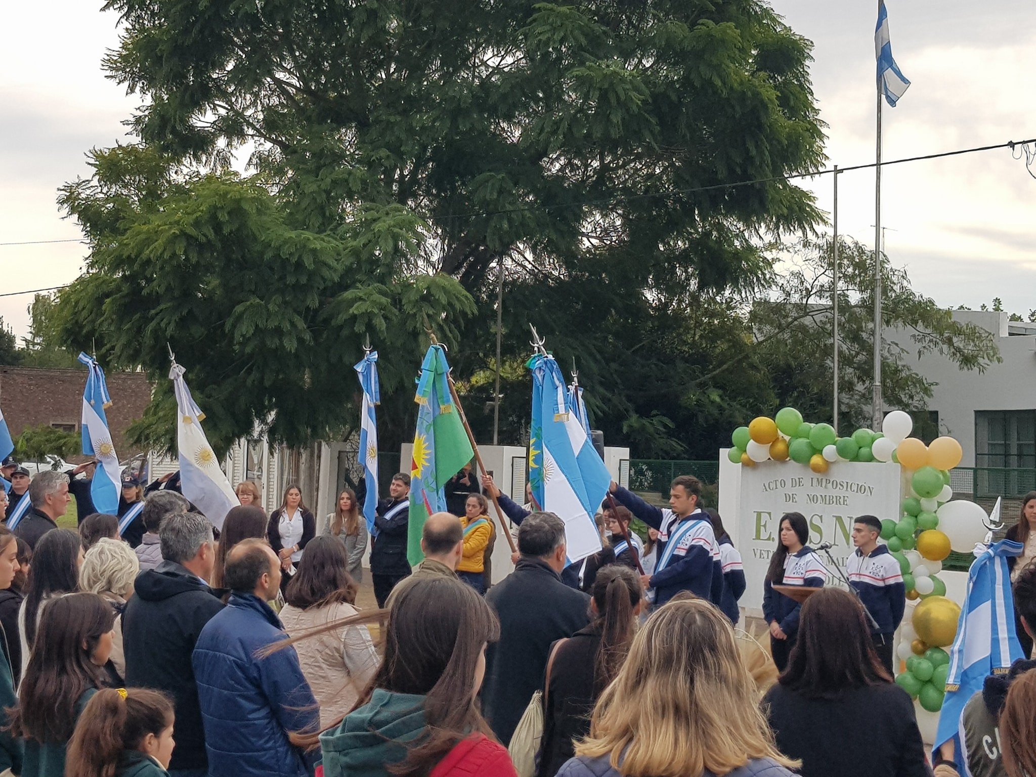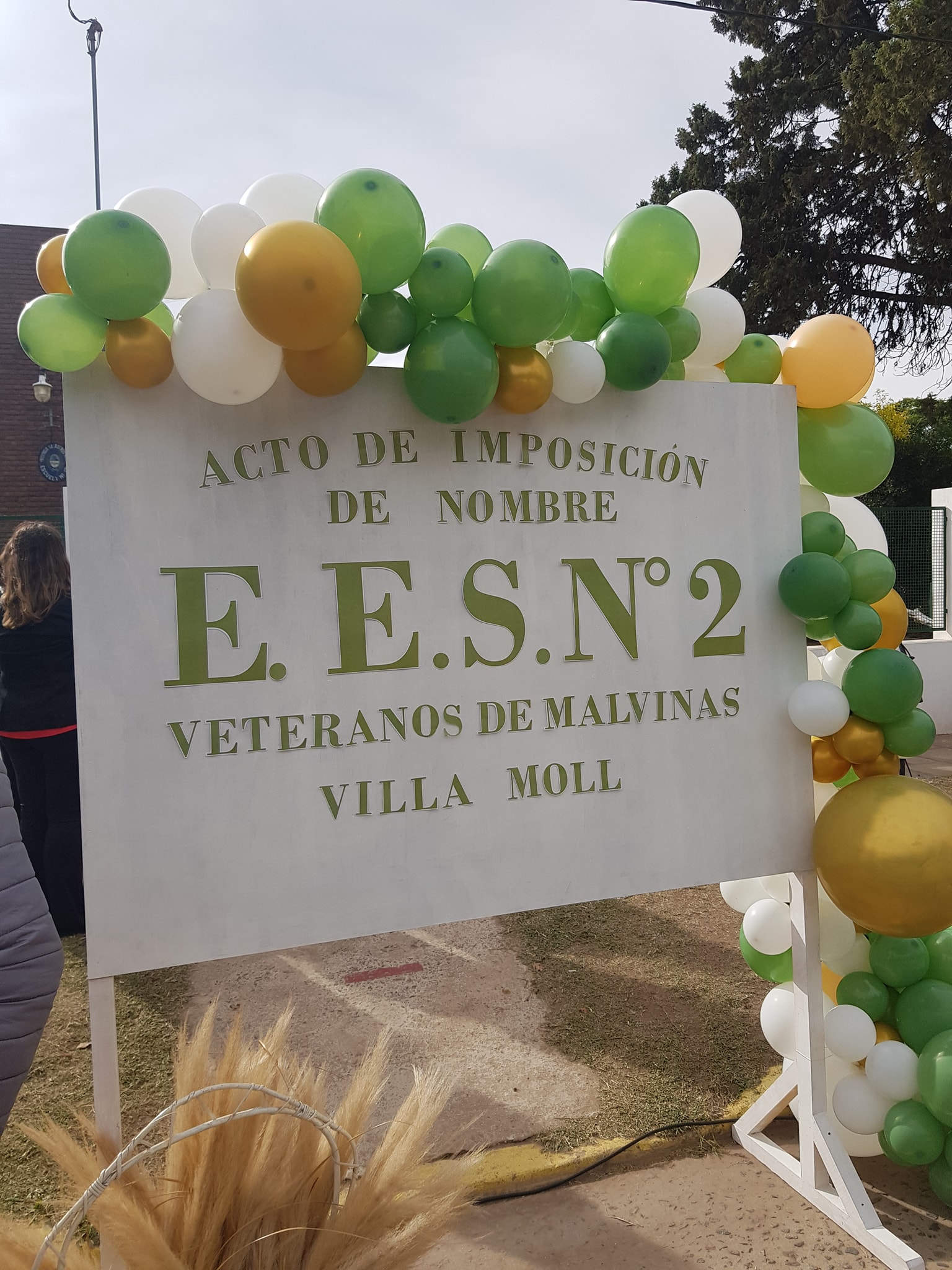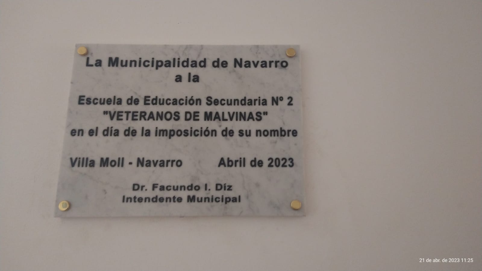 Con la presencia de varias instituciones, escuelas secundarias de Navarro, Almeyra, Las Marianas, Escuelas 16, 20, 8 y sus respectivos abanderados y jardines de infantes, además de referentes de diferentes agrupaciones políticas, se llevó a cabo este viernes a las 10 de la mañana, el acto de imposición del nombre «Veteranos de Malvinas» a la E.E.S. Nº 2 de Villa Moll. Hicieron uso de la palabra, el Intendente Facundo Diz, la señorita Alejandra Guardia, la directora de secundaria, Florencia Barreira y los veteranos Raúl Díaz y Daniel Torres. Luego se recibió a los invitados con chocolate caliente y al finalizar el acto, se realizó un pequeño ágape. Tambien hicieron uso de la palabra alumnos que egresan, Felipe Moreno, Fausto Bizcarra y Alejo Faccini.
