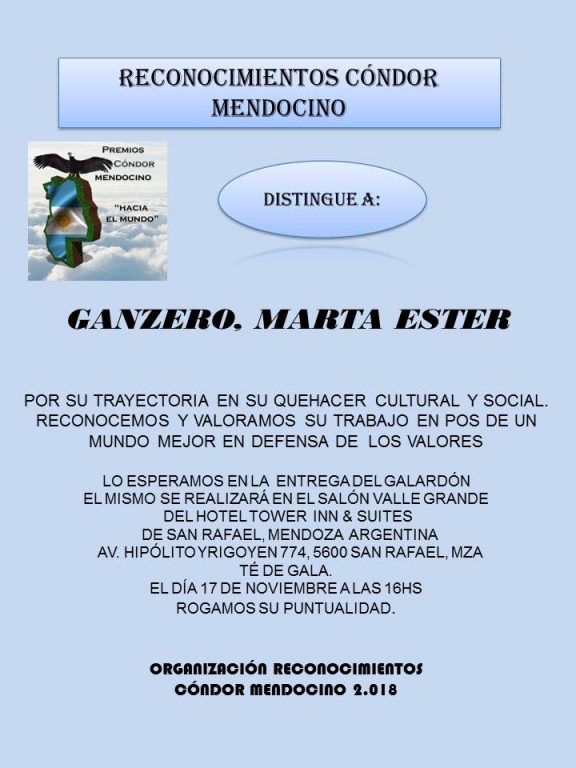 Hace un tiempo, Marta Ganzero envió su currículum literario como postulación para la Comisión de los Premios Cóndor Mendoza. El jurado, luego de evaluarlo le envió la siguiente nominación: LE COMUNICAMOS POR LA PRESENTE, QUE USTED HA SIDO SELECCIONADO PARA RECIBIR EL GALARDÓN CÓNDOR MENDOCINO, FELICITACIONES ATENTAMENTE LIC. ADELA ELISA CORNEJO PROF. GUILLERMO ADRÍAN SALINAS […]