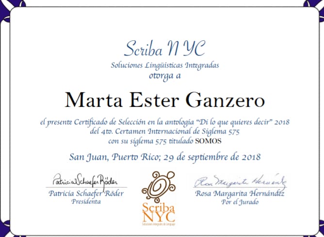 La antología consta de trabajos en siglema 575, poesía minimalista. Derivan del haiku japonés y cada estrofa de 3 versos funciona independiente en la temática y parte del conjunto en toda su extensión. Resulta un acróstico a partir de la inicial de cada primer verso de cada estrofa y eso determina el tema del poema. Marta participó con tres siglemas. El libro está a la venta por Amazon.