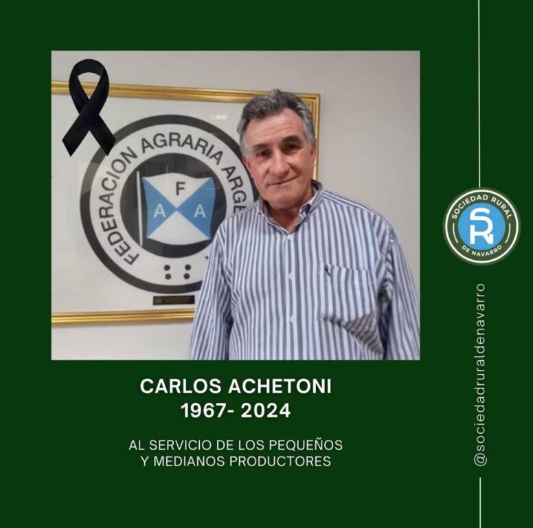 La Sociedad Rural de Navarro lamenta con profundo pesar el fallecimiento de Carlos Achetoni, presidente de la Federación Agraria Argentina. Siempre lo recordaremos por su incansable labor en defensa de los pequeños y medianos productores y por su compromiso con las economías regionales que tanto y tan dignamente representó.