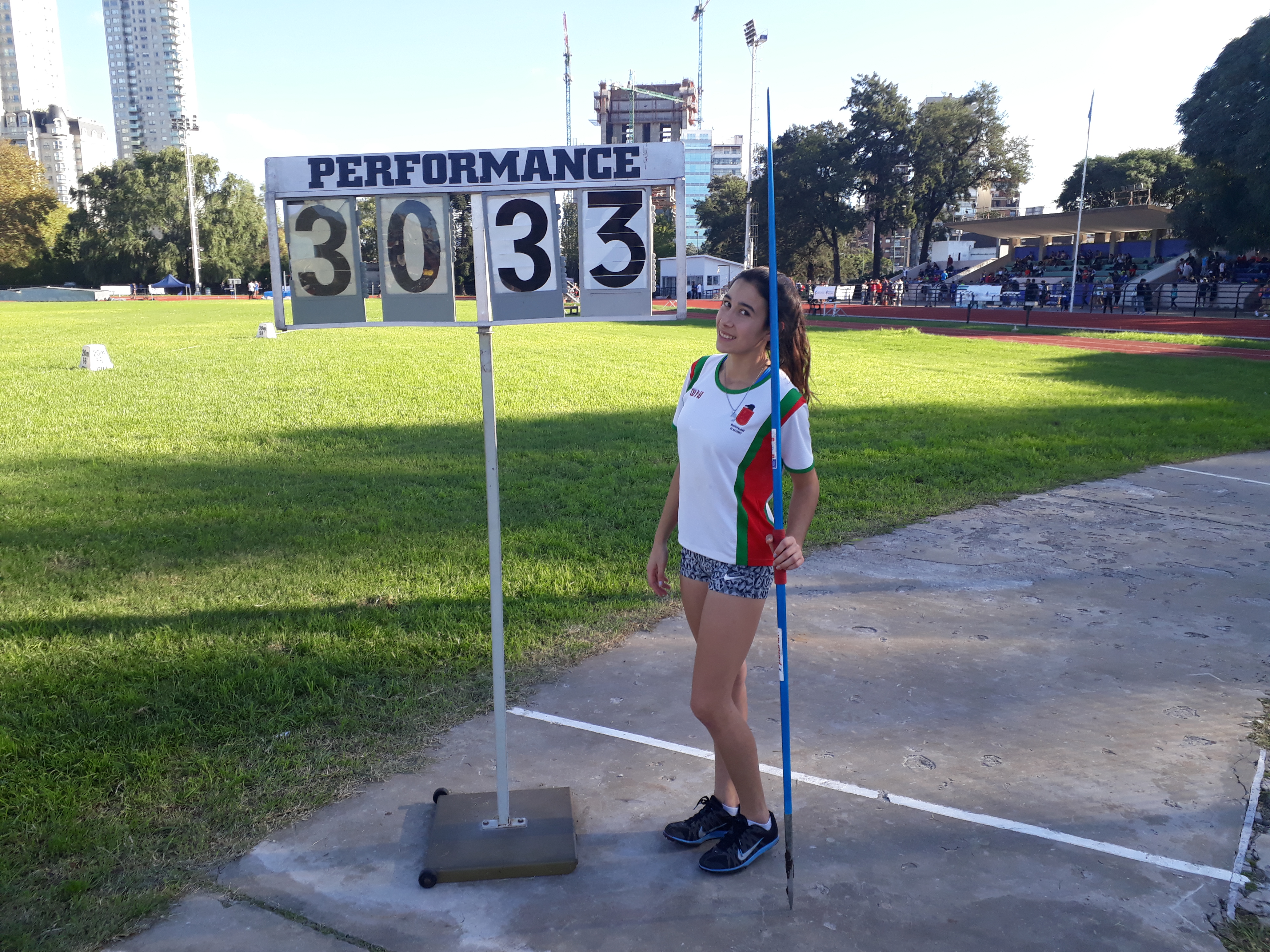 Con una marca de 30.33 metros, la atleta de la Escuela Municipal de Navarro, entrenada por el Profesor y Entrenador de la Federación Internacional de Atletismo, Damián de la Fuente, logró quedar 1ra en el ránking del lanzamiento de la jabalina de la provincia de Buenos Aires, en la categoría U18.