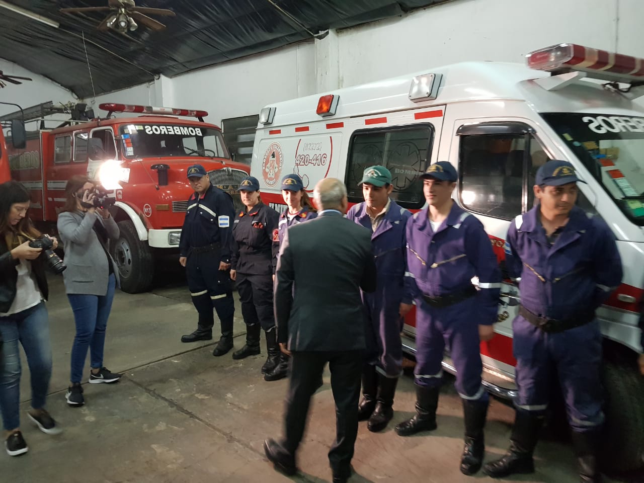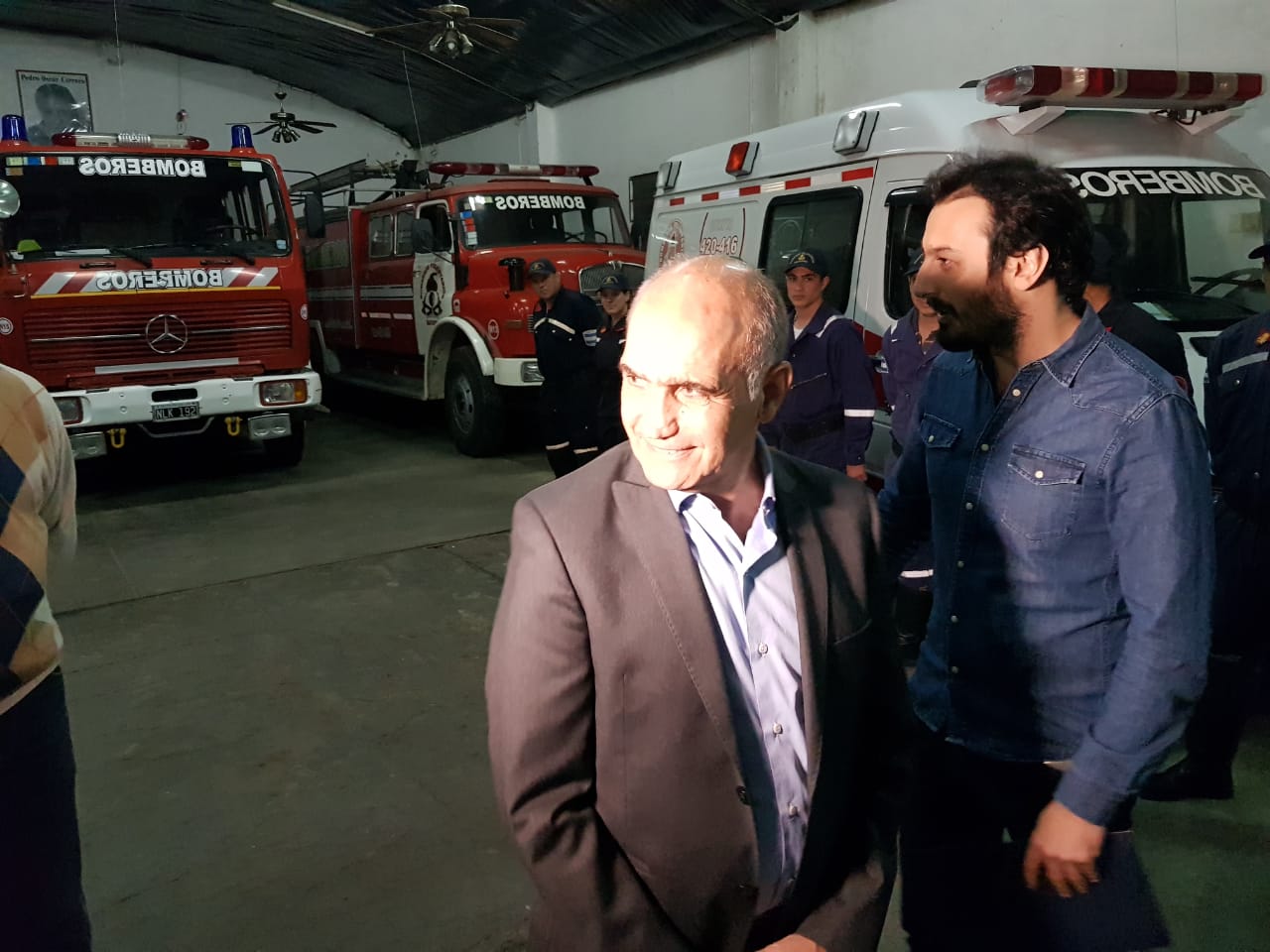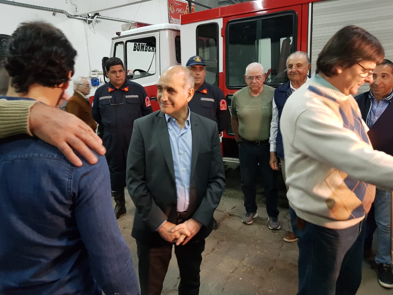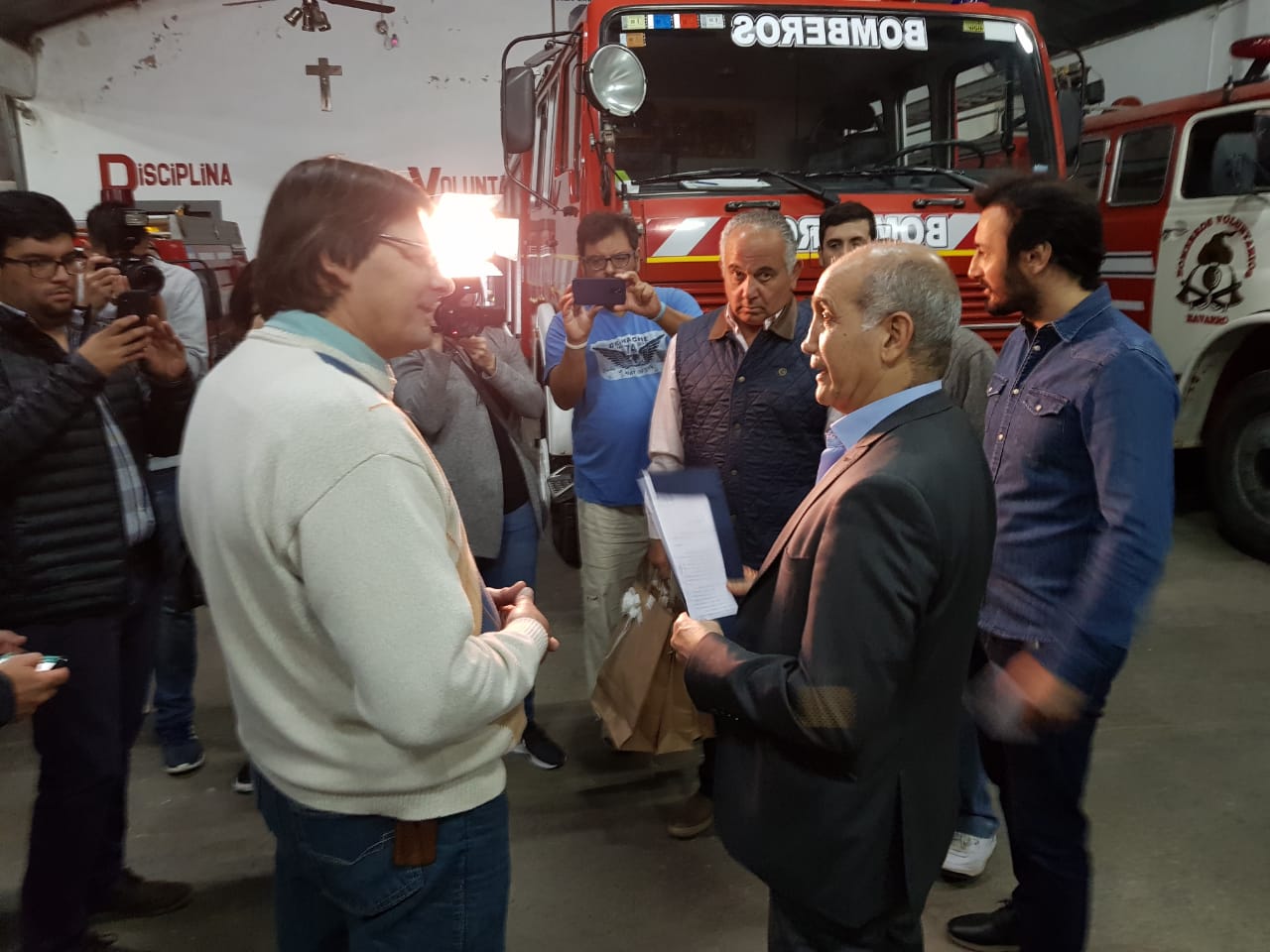 Luego de la charla con el Intendente, la conferencia de prensa que se desarrolló en el Honorable Concejo Deliberante y la reunión con miembros de la Sociedad Rural de Navarro, Salvador visitó a nuestros bomberos voluntarios. Fue una visita breve en la que aprovechó para saludar al cuerpo completo, uno por uno y para hacer entrega de la documentación de dos vehículos que se utilizaban en el Senado de la Pcia. y que dentro de unos 10 días, pasarán a ser parte de la flota del cuerpo activo local.