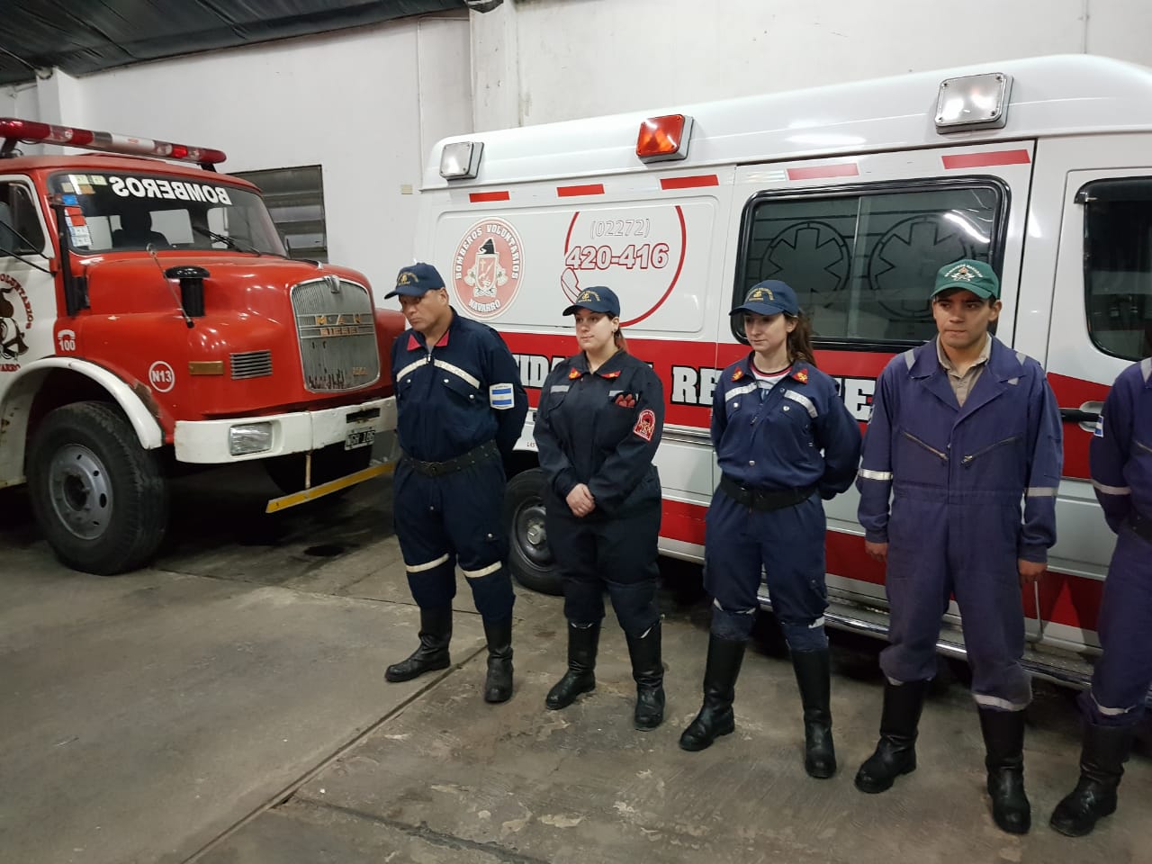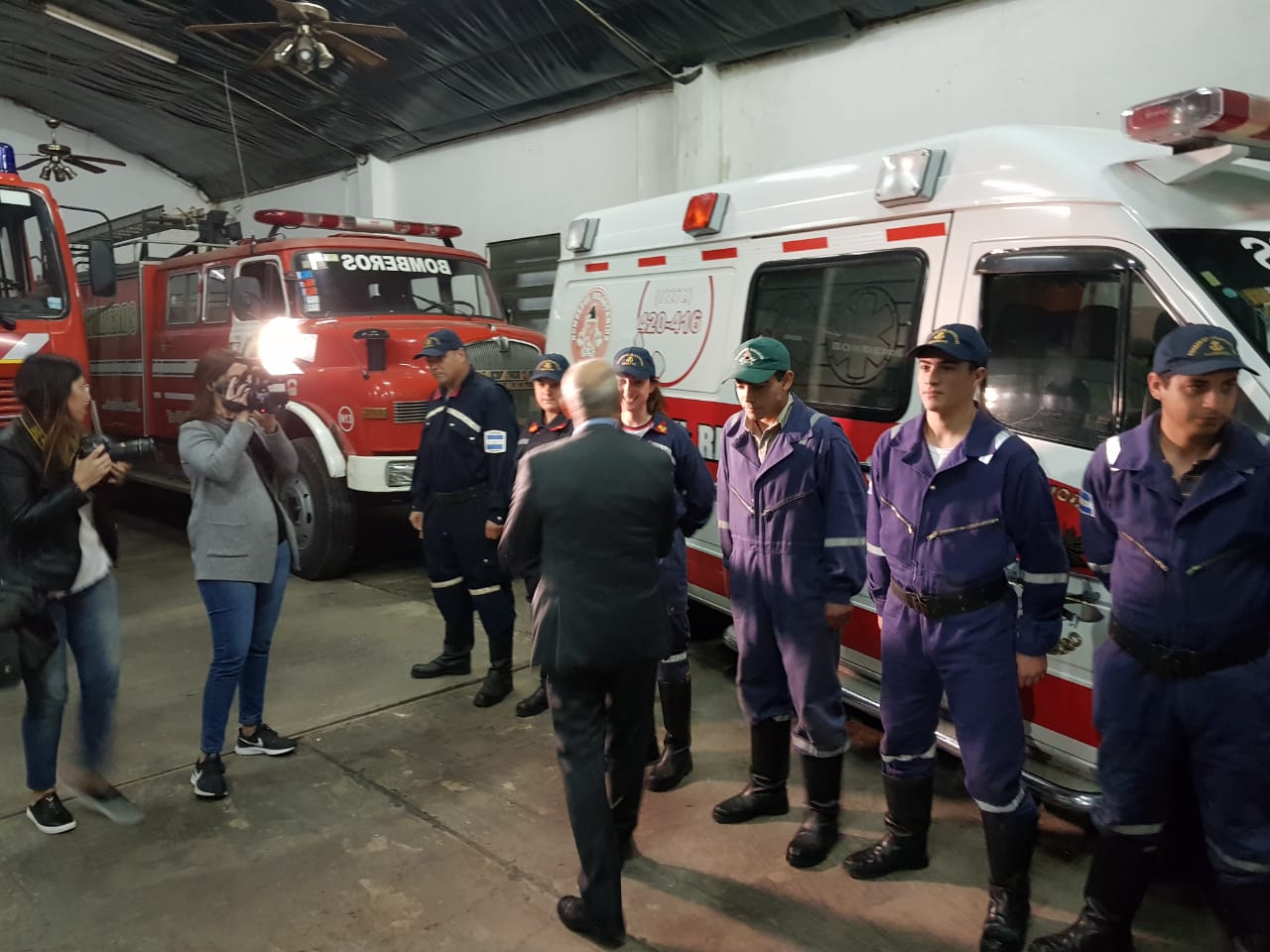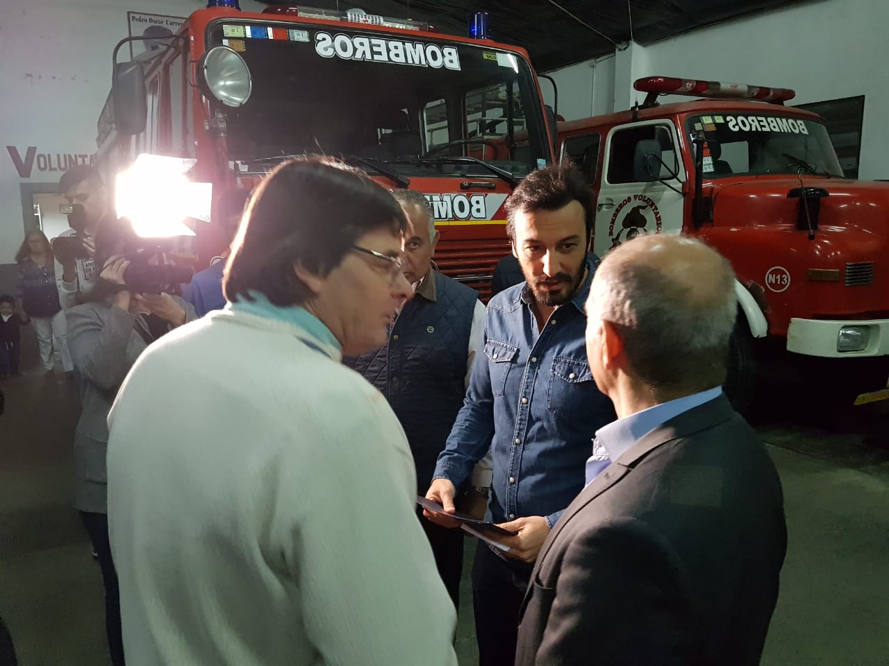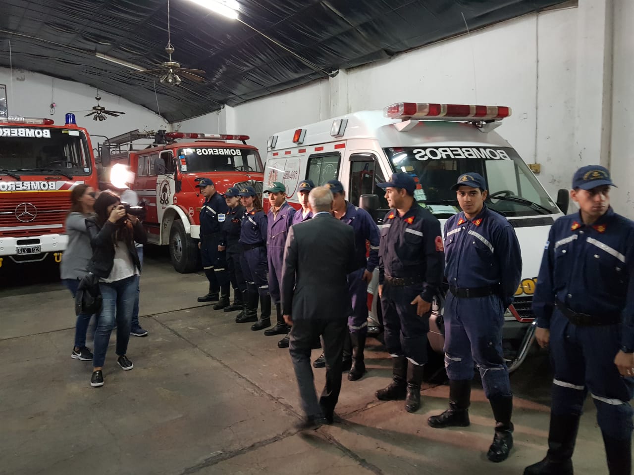 Luego de la charla con el Intendente, la conferencia de prensa que se desarrolló en el Honorable Concejo Deliberante y la reunión con miembros de la Sociedad Rural de Navarro, Salvador visitó a nuestros bomberos voluntarios. Fue una visita breve en la que aprovechó para saludar al cuerpo completo, uno por uno y para hacer entrega de la documentación de dos vehículos que se utilizaban en el Senado de la Pcia. y que dentro de unos 10 días, pasarán a ser parte de la flota del cuerpo activo local.