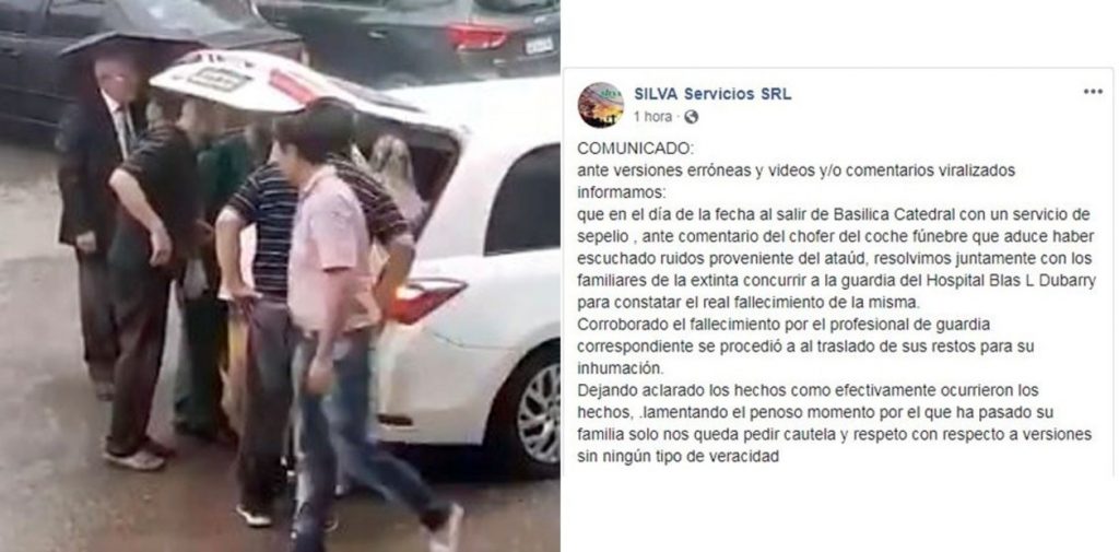 La empresa que realizó el servicio debió aclarar en Facebook qué había ocurrido. Según esa versión, el conductor del auto escuchó ruidos que provenían del ataúd. Ante esa increíble situación, la familia decidió desviar el recorrido y dirigirse rápidamente hasta el Hospital local Blas. L Dubarry para constatar realmente el fallecimiento de la jubilada.