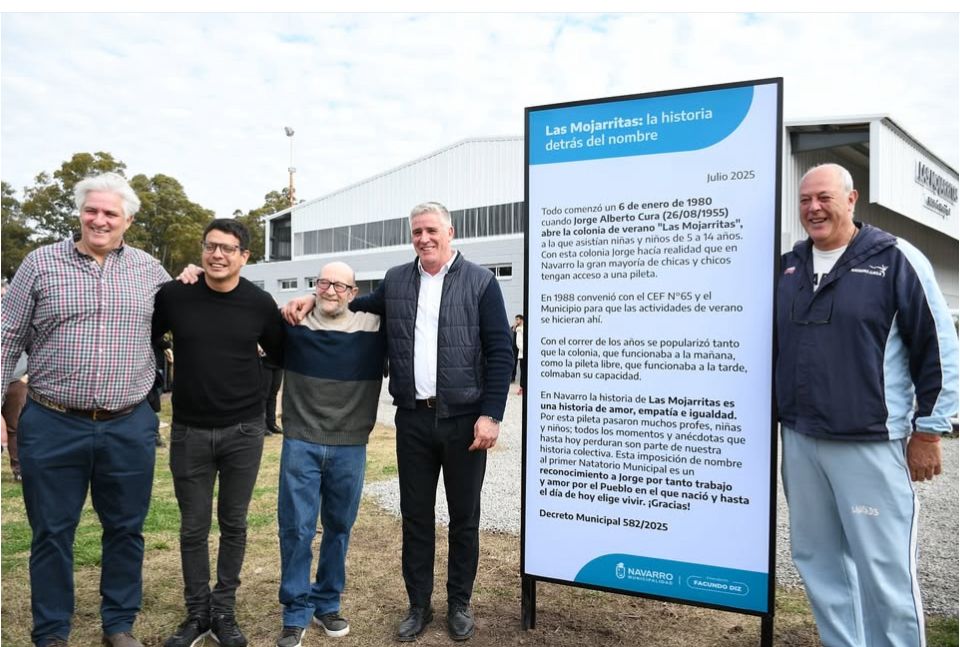 En el día de ayer, en el Polideportivo Jorge Miguel Diz, se realizó el acto en el que impusieron el nombre «Las Mojarritas» al natatorio municipal allí enclavado. De acuerdo a lo que expresaron textualmente desde el Municipio, el nombramiento fue «en honor a la pileta de Jorge Chino Cura», quien estuvo presente en compañía de familiares y compañeros históricas de la colonia que dirigía. Estuvieron el Intendente Facundo Diz y el Subsecretario de Deportes de la provincia de Buenos Aires, Cristian Cardozo. Además en el mismo acto, el Secretario de Deportes, Jorge Diz, recibió en mano la llave de una combi 0 km. para que los deportistas de Navarro puedan viajar a competir en cada una las disciplinas deportivas que requieran traslados.