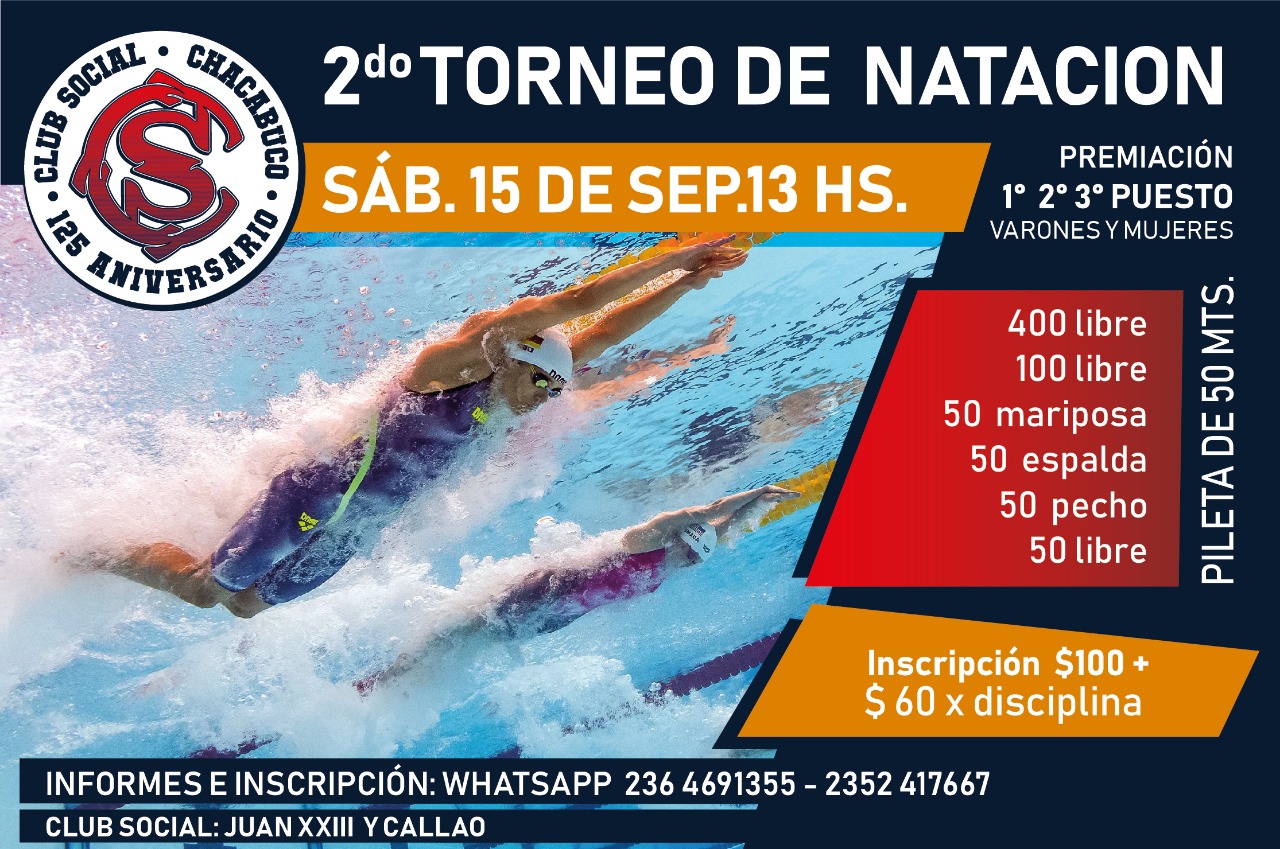 El Club Social Chacabuco en su 125 Aniversario, realizó hoy el segundo torneo de natación para los siguientes estilos: