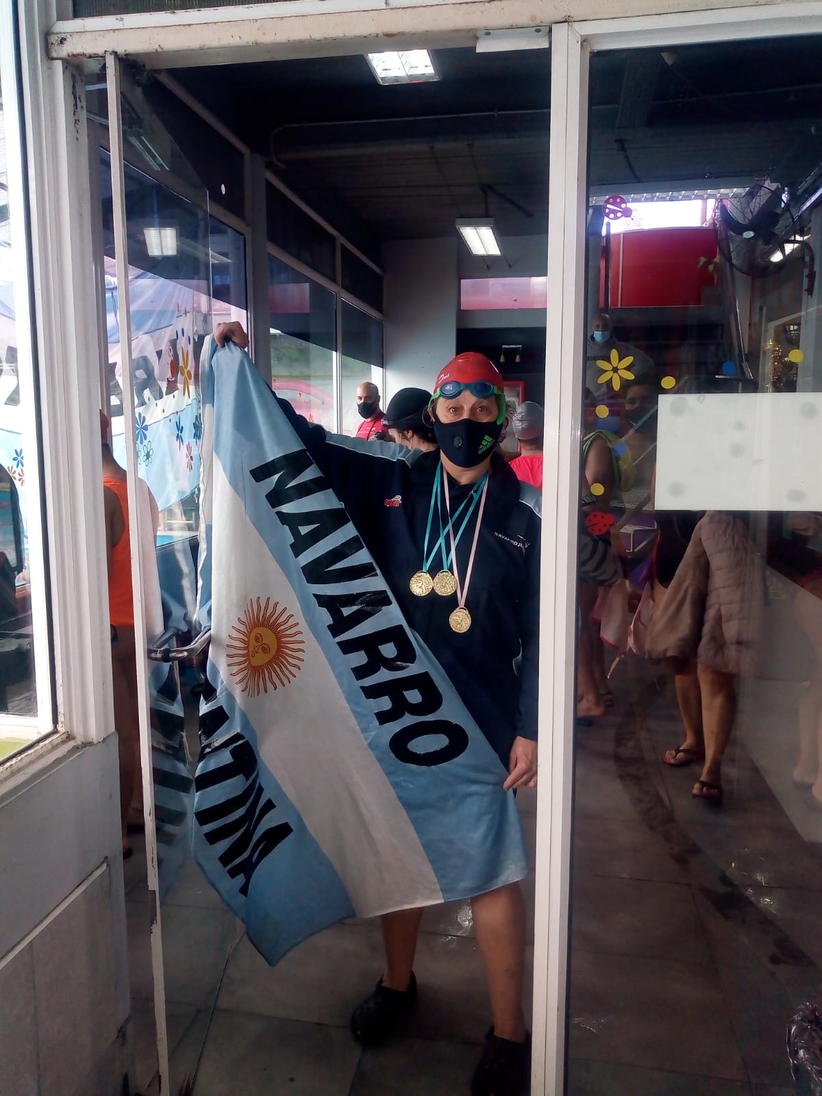 Tal como lo habíamos anticipado, en el día de hoy, la nadadora navarrera Gladys Fernández volvió a competir tras una larga inactividad producida por la pandemia. En el Club Castelar, FENADO organizó una serie de pruebas. Gladys ganó en un principio, la serie de 200 metros libres y quedó primera en su categoría. Luego hizo lo mismo en 50 libres (velocidad pura) a pesar de no ser su especialidad. Ya con dos victorias a cuestas, participó de 100 espaldas. A pesar del cansancio, ganó nuevamente y se trajo tres medallas para nuestra ciudad. Gladys nos comentó que está muy contenta por el objetivo logrado, pero que hay que seguir entrenando a full en pileta, ya que a raíz de la larga inactividad, no se sintió como hubiese querido.