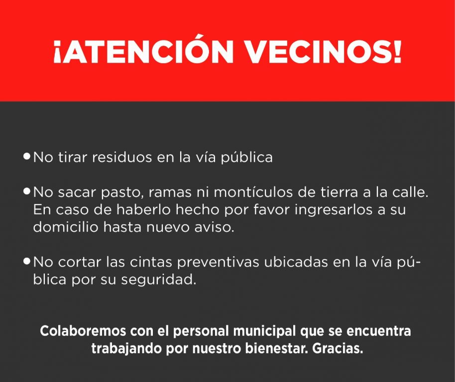No sacar pasto, ramas ni montículos de tierra a la calle. En caso de haberlo hecho por favor ingresarlos a su domicilio hasta nuevo aviso.