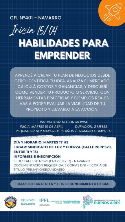 El Centro de Formación Laboral N°401 abre la inscripción al curso Habilidades para Emprender, destinado a personas que tengan una idea, un proyecto o el deseo de iniciar un emprendimiento. El curso brinda herramientas prácticas para desarrollar y poner en marcha un emprendimiento con claridad, confianza y estrategia.