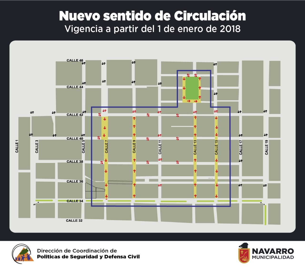 La Coordinación de Seguridad y Defensa Civil de la Municipalidad de Navarro, envía el siguiente cronograma informativo en el que se explica el nuevo sentido de circulación de algunas calles a partir del 1 de enero de 2018.
