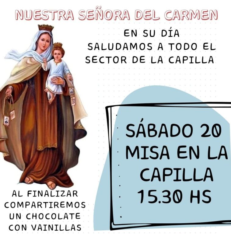 Desde la Parroquia San Lorenzo Mártir informaron en el transcurso de esta mañana, que el sábado en su día habrá Misa en la Capilla Nuestra Señora del Carmen. La misma comenzará a las 15,30 y al finalizar se compartirá un exquisito chocolate con vainillas.