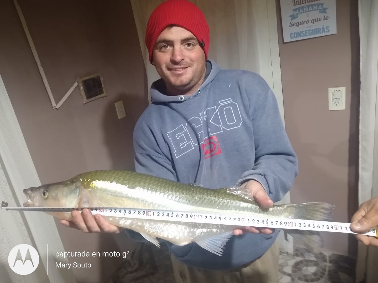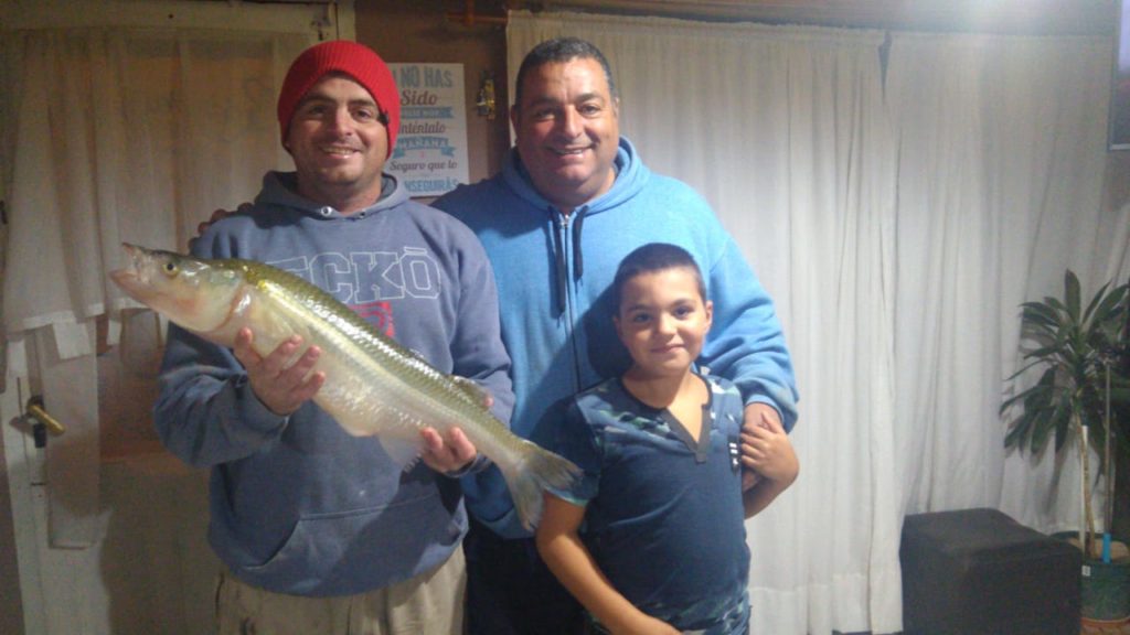 “Arrancamos a la mañana buscando al peje en esta laguna -La Arenera- que es brava, además de la llovizna, el viento, hubo que salir a buscarla, habíamos tenido poco pique y pasando el mediodía dejo la línea anclada y veo que uno de los corchitos se movía para el costado, lo encaño y no pasaba nada, después quedó ensartado en el pescado y mocha la línea. Jamás pensé que iba a sacar un pescado tan grande como lo soñé, era tan grande que no entraba en el copo, así que se enojó el pescado y empezó la pelea que es lo más lindo. Estábamos embarcados y nos dio dos peleitas muy lindas y una adrenalina hermosa entre mi papá y yo. Le pusimos “dinosaurio” por la edad que me dijeron es de un promedio de más o menos 20 años”.