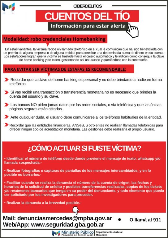 Es muy IMPORTANTE recordar a la población en general que la clave de home banking es personal y no debe brindarse a nadie en forma telefónica. Más aún, hay que recordar que de tratarse de una acreditación monetaria a la cuenta del usuario dicha clave no es necesaria para realizar algún tipo de transferencia.