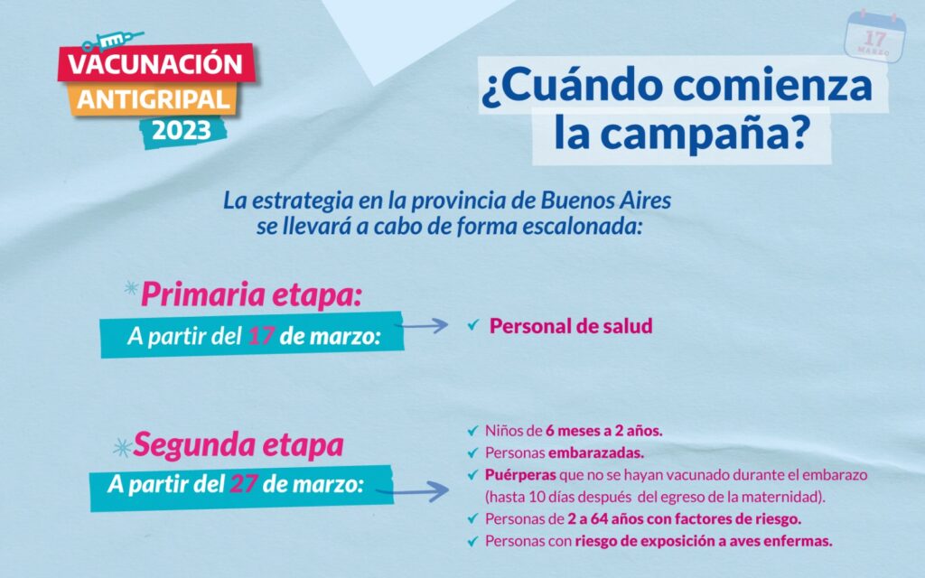 De acuerdo a lo informado por el Gobierno de la provincia de Buenos Aires en su propio portal, ya dio comienzo la segunda etapa de la Campaña de Vacunación Antigripal 2023, destinada a niños y niñas de 6 meses a 2 años de edad; personas embarazadas; puérperas que no se hayan vacunado durante el embarazo; personas de 2 a 64 años con factores de riesgo y quienes tienen riesgo de exposición a aves enfermas. En la primera etapa, que comenzó el 17 de este mes, se habría convocado al personal de salud quienes, si aún no se vacunaron, pueden concurrir a cualquier vacunatorio público de la Provincia y solicitar la inmunización. La vacuna antigripal  según indican, está disponible para todos los grupos mencionados, es gratuita en todos los vacunatorios bonaerenses y no requiere orden médica. No recibimos información aún, sobre en qué lugar de nuestra localidad la están aplicando, pero desde Provincia, indica que son los siguientes:
