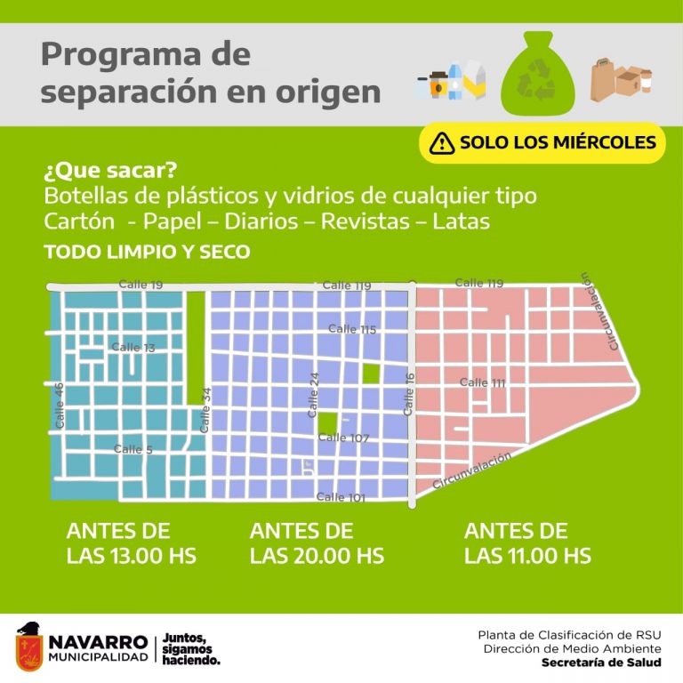 La Municipalidad de Navarro informa por medio de la Dirección de Medio Ambiente, que continúa la recolección del programa Separación en Origen. La misma se hace TODOS LOS MIÉRCOLES: