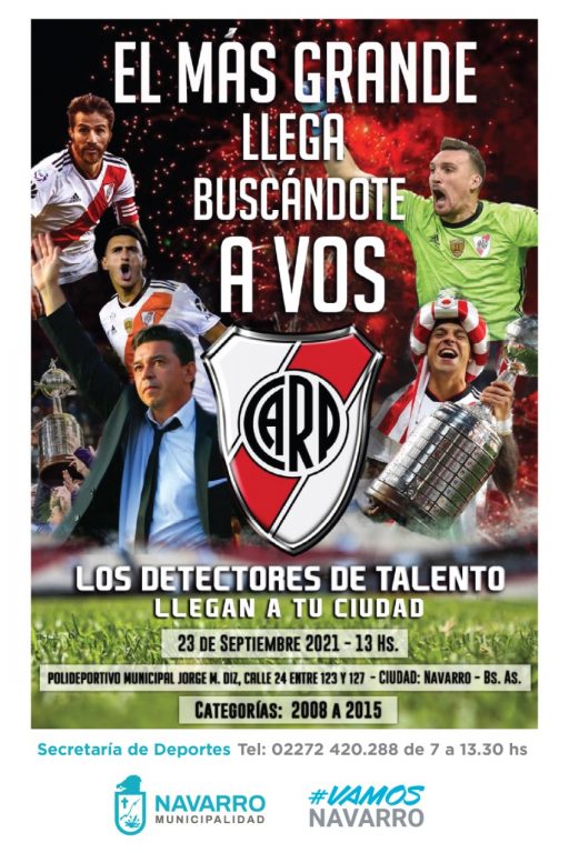 Tal como lo ha venido haciendo últimamente en distintas ciudades, River Plate llegará a nuestra ciudad para probar jugadores. Los detectores de talentos llegarán el próximo jueves 23 de septiembre a las 13 al polideportivo Jorge Miguel Diz y la prueba estará destinada a jugadores nacidos entre los años 2008 al 2015. Para informes dirigirse a la Secretaría de Deportes Municipal de 7 a 13,30 o llamar al fijo 02272 420288.