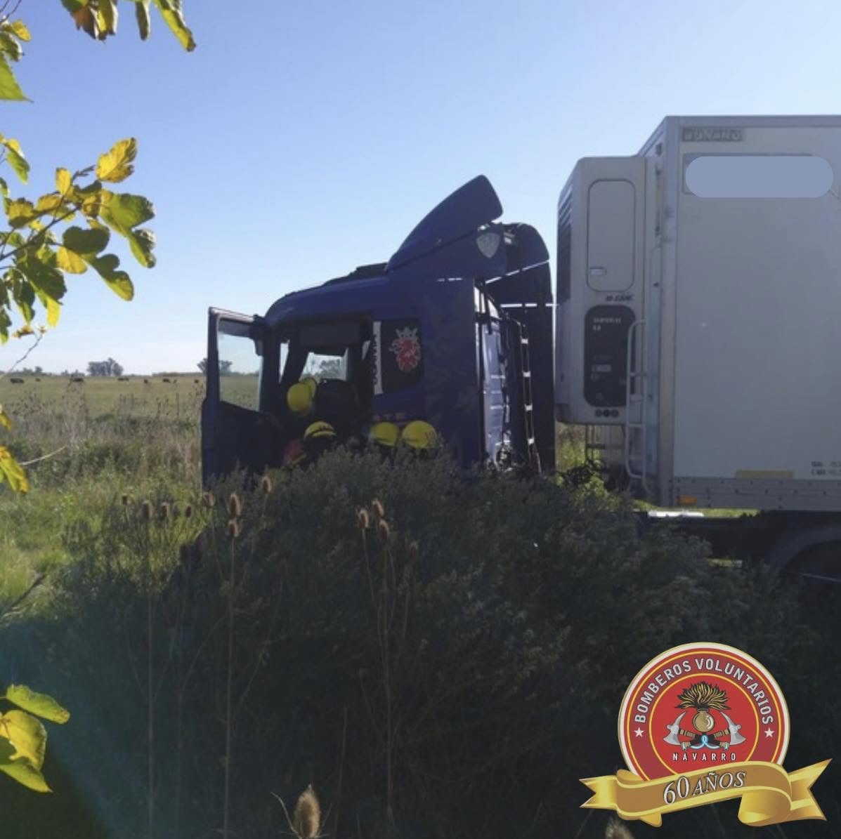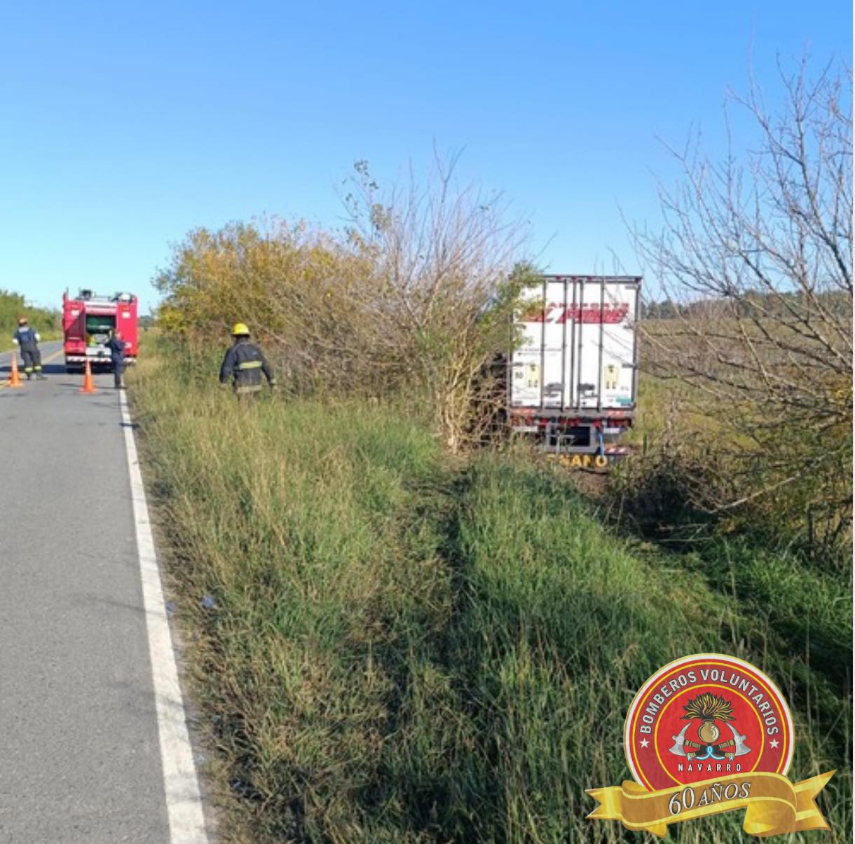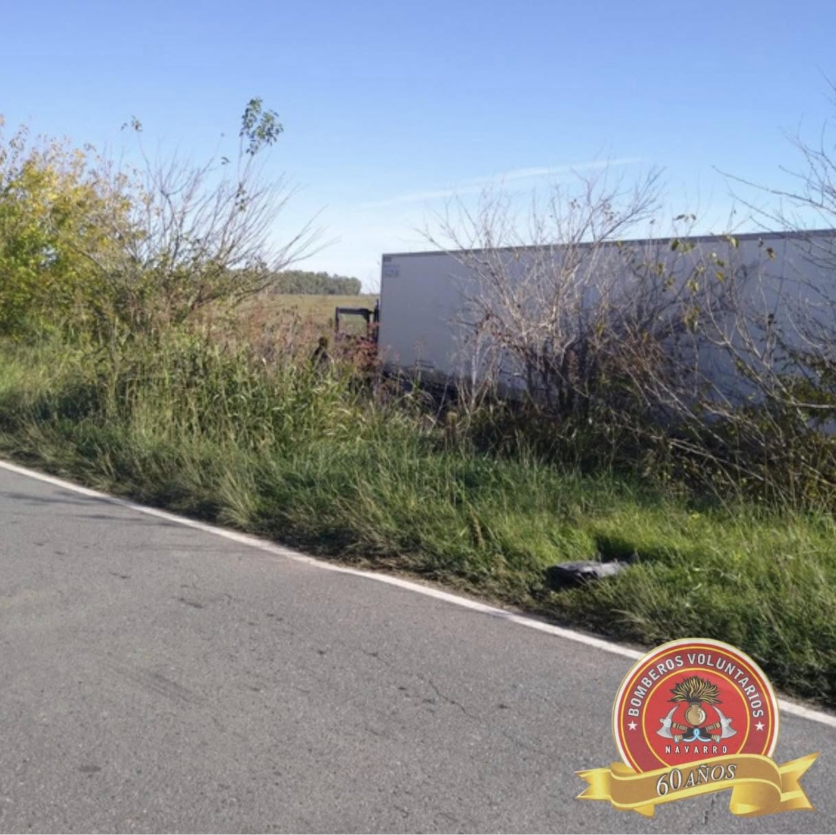 Siendo las 9,42 de este martes, 4 unidades de los Bomberos Voluntarios de Navarro acudieron a ruta 40 km 86.3, debido al despiste del camión Scania que se observa en las imágenes. Trasladaron al chofer, oriundo de Cipoletti, descompuesto a nuestro hospital. Es toda la información con la que contamos hasta este momento, proveniente del cuartel central.