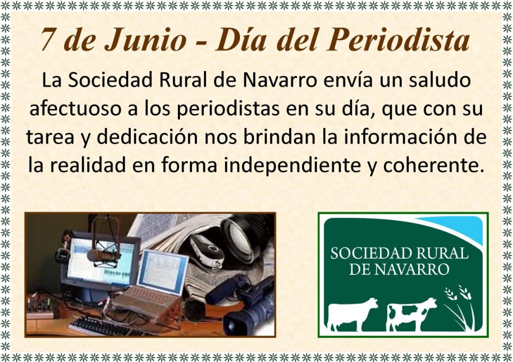 La Sociedad Rural de Navarro envía un saludo afectuoso a los periodistas en su día, que con su tarea y dedicación nos brindan la información de la realidad en forma independiente y coherente.