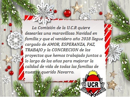 La Comisión de la U.C.R. quiere desearles una maravillosa Navidad en familia y que el venidero año 2018 llegue cargado de AMOR, ESPERANZA, PAZ, TRABAJO y la CONCRECIÓN de los proyectos que hemos trabajado juntos a lo largo de los años para mejorar la calidad de vida de todas las familias de nuestro querido Navarro.