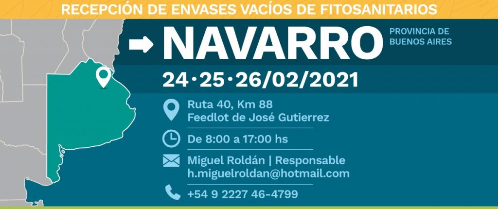 Los próximos 24, 25 y 26 de febrero se llevará a cabo la segunda campaña de recepción de envases vacíos de fitosanitarios. Recordemos un poco, quienes organizan, cuál es la propuesta y como coordinar disponibilidad de lugar en la entrega: CampoLimpio es una organización que se fijó como misión recuperar los envases vacíos de fitosanitarios en el campo argentino. El campo de Navarro se plegó a esta importante iniciativa, que se realizará a través del OPDS (Organismo Provincial para el Desarrollo Sostenible) con la participación de la Sociedad Rural local, agronomías locales y el CIAN (Círculo de Ingenieros Agrónomos de Navarro). Nos comentan que también se suman a esta campaña, CAPUBA (Cámara de Agroaplicadores de la provincia de Buenos Aires) y CEDASABA (Cámara Empresaria de Distribuidores de Agroquímicos, Semillas y Afines Bonaerense).