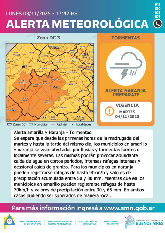 El Servicio Meteorológico Nacional emitió este lunes a las 17,42, un alerta amarillo para las localidades de Navarro, Lobos, Mercedes, Luján, Roque Pérez, Saladillo, S.A. de Giles, Carmen de Areco, San Antonio de Areco y Salto dentro de la zona DC3. El área será afectada según indican, por tormentas de variada intensidad, algunas localmente fuertes. Las mismas podrían provocar abundante caída de agua en cortos períodos con valores de precipitaciones de entre 30 y 65 mm. e intensas ráfagas que podrían alcanzar localmente los 70 km/h. Abarca el período comprendido desde la madrugada hasta la tarde del martes 4.