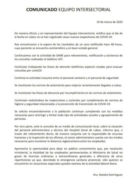 Hoy por la mañana además del de Luján, recibimos los informes de Navarro y de Lobos. En nuestra ciudad, gracias a Dios y al esfuerzo de los vecinos, seguimos y seguiremos sin casos, tanto sospechosos como confirmados y en la vecina localidad de Lobos, ocurre exactamente lo mismo CERO casos.