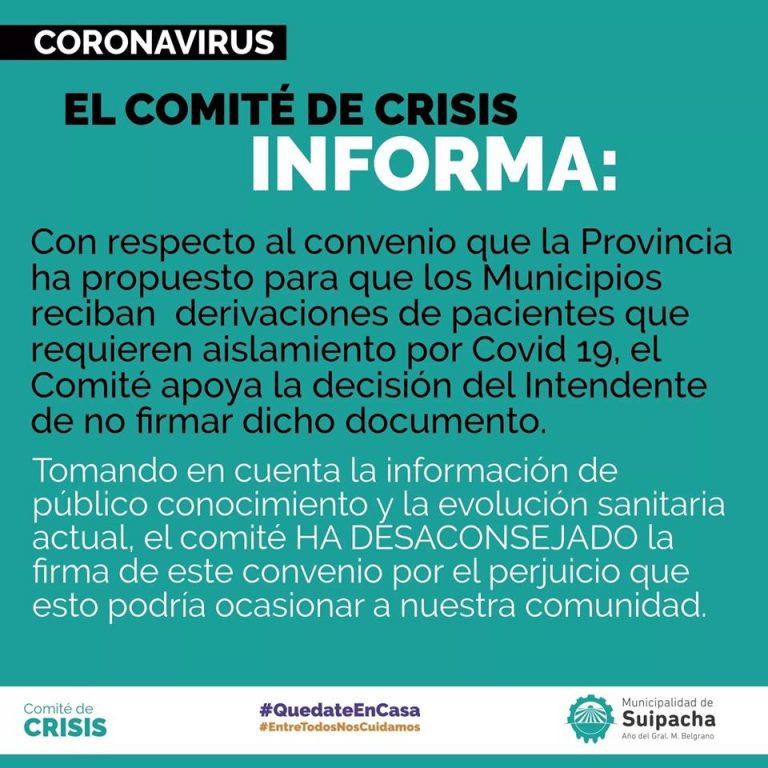 Con respecto al convenio que la Provincia ha propuesto para que los Municipios reciban derivaciones de pacientes que requieren aislamiento por COVID 19, el Comité apoya la decisión del Intendente de no firmar dicho documento.