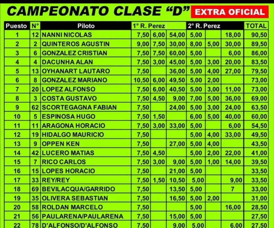 La clase D del Bonaerense está acaparando la atención de los navarreros amantes de los fierros, tal como en una época lo hizo el TC Roqueperense. Se disputaron sólo dos competencias este año, pero de todos modos ya llegaron buenas noticias para estos lados. Se pudo saber extraoficialmente, que el campeonato 2024 luego de estas dos pruebas, es liderado por Nicolás Nanni. Nico es seguido por Agustín Quinteros a un punto y por Cristian González a 4,50. Juanca Garrido marcha en el puesto 18 y Facundo Romero en el 26. La tercera fecha será el 4 y 5 de mayo con pilotos invitados en Gualeguaychú. Estaremos informando.
