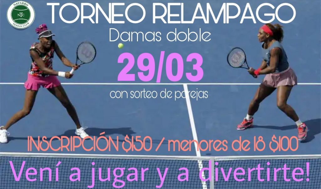 Este jueves 29 en Navarro Tenis Club, habrá un Torneo Relámpago de Dobles Damas con sorteo de parejas. Vení a jugar y divertirte. Inscripción $150, menores de 18 $100. No faltes.