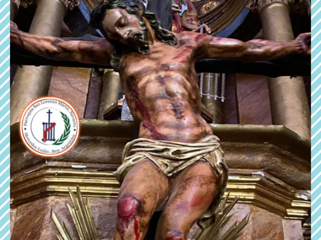 «Cristo Crucificado». Perteneció a Monseñor de Andrea. Cumpliendo su deseo, fue entregado a la Parroquia San Lorenzo de Navarro hace cincuenta años por Monseñor Keegan (quien fuera uno de sus más cercanos colaboradores). La tradición oral indica que la obra es muy antigua. Hemos decidido saber de qué tiempos data.