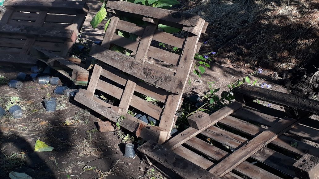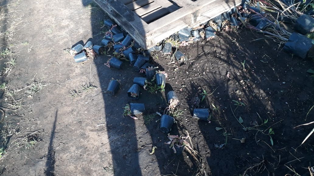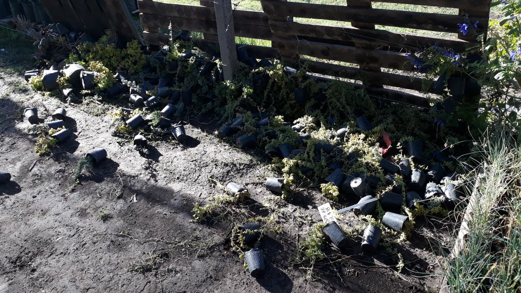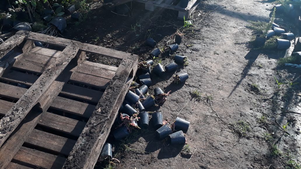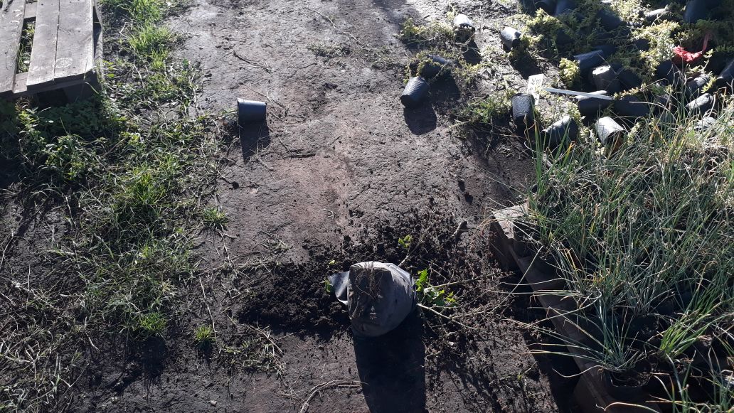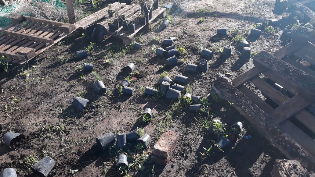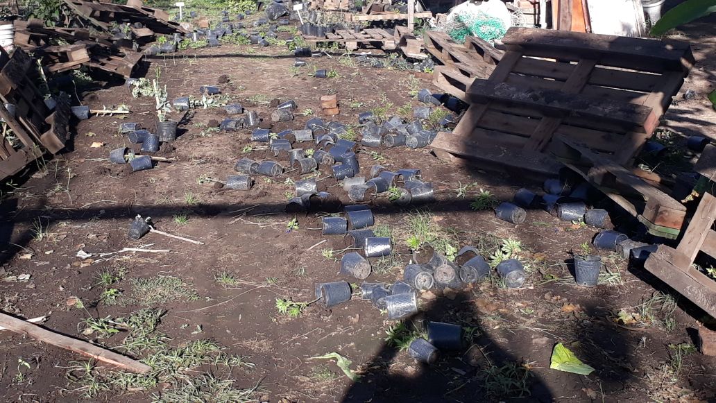Hipotéticamente en la noche de ayer o la madrugada de hoy, alguien ingresó al vivero y desparramó la producción de plantines por todos lados. Los plantines estaban encima de plataformas de madera bastante pesadas, y éstas, también fueron dadas vuelta, inclusive algunas, como se ve en las fotos fueron utilizadas para aplastar los plantines.
