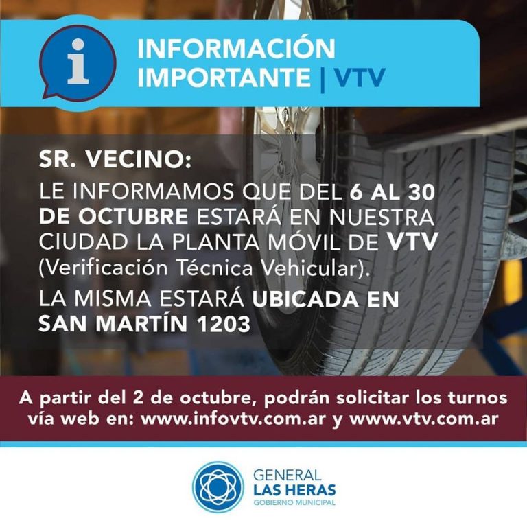 Sr. vecino, le informamos que del 6 al 30 de octubre estará en nuestra ciudad la Planta Móvil de V.T.V. (Verificación Técnica Vehicular). La misma estará ubicada en San Martín 1203.