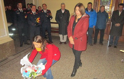 Finalmente, el Intendente y el Jefe del cuerpo activo de Bomberos Voluntarios de Lobos, Comandante Mayor Roberto Rubino, colocaron la ofrenda al pie del monumento a los servidores públicos en la Plaza 1810, y el Padre Mosca rezó por los bomberos fallecidos.